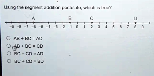 Using the segment addition postulate, which is true? A B C D -9 -8 -7 -6 -5 -4 -3 -2 -1 0 1 2 3 4 5 6 7 8 9 ? AB + BC = AD ? AB + BC = CD ? BC + CD = AD ? BC + CD = BD