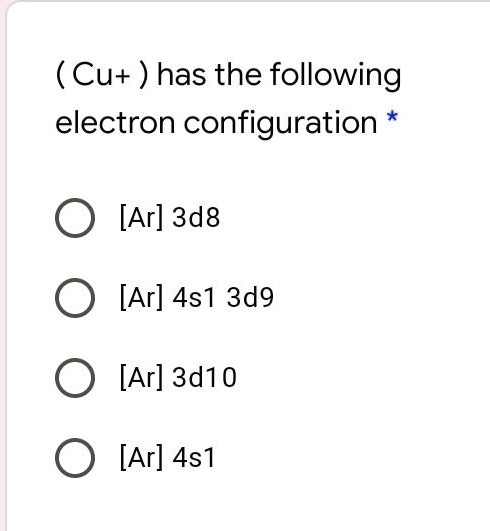 (Cu+) has the following electron configuration: [Ar] 3d^10 4s^1