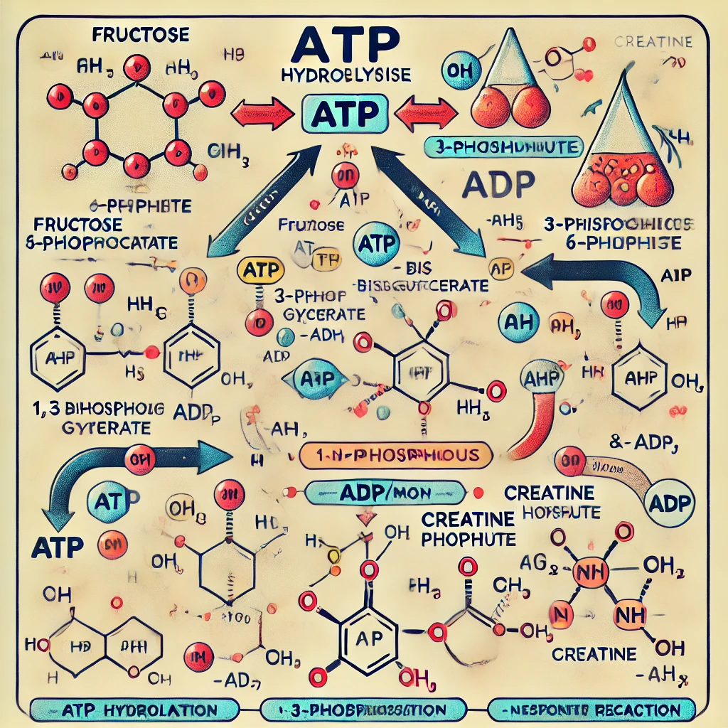 ATP hydrolysis releases a significant amount of energy (–30.5 kJ/mol), making it a common driving force in coupled biochemical reactions. To evaluate the direction of each reaction, we analyze the free energy change of the overall process by comparing the ΔG°’ of ATP hydrolysis with that of the product being formed.