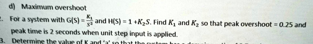 Find K1 and K2 so that peak overshoot = 0.25 and peak time is 2 seconds when unit step input is applied.
