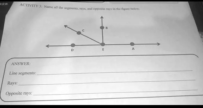 Name all the segments, rays, and opposite rays in the figure below. ANSWER: Line segments: Rays: Opposite rays: B C D E A
