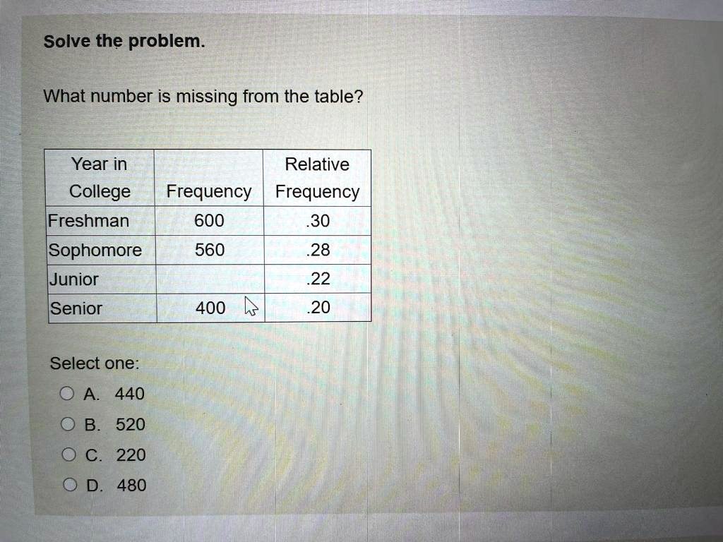 ? Year in College Freshman Relative Frequency Frequency 600 30 Sophomore 560 28 Junior 22 Senior 400 20 Select one: 0 A 440 B. 520 C 220 D. 480
