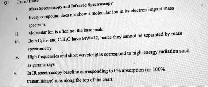 True/False Mass Spectroscopy and Infrared Spectroscopy i. Every compound does not show a molecular ion in its electron impact mass spectrum. ii. Molecular ion is often not the base peak. iii. Both