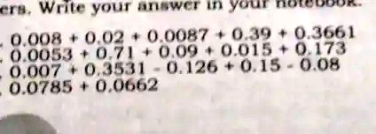 In solving these expressions, precision is key. Each decimal number contributes to the final sum, meaning careful alignment is necessary to avoid calculation errors. The first two sets require only addition, which is straightforward. Summing values with different decimal places involves aligning numbers correctly before addition.