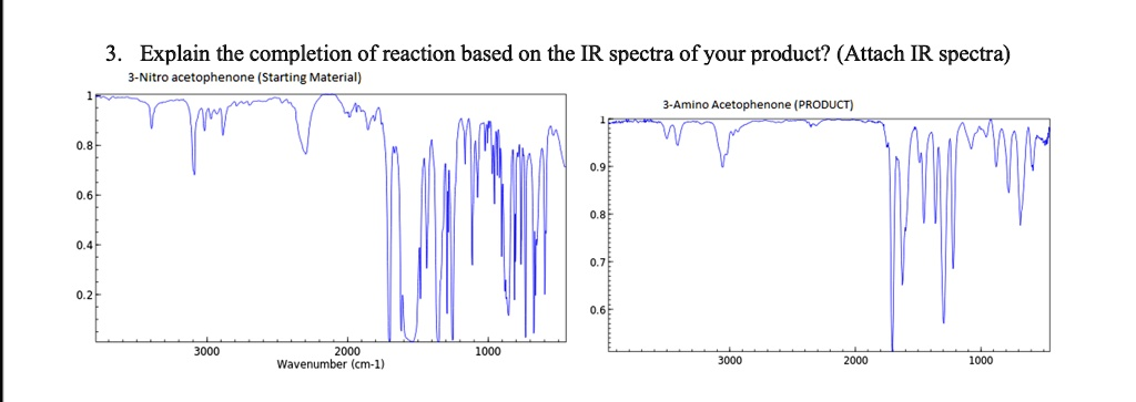 Explain the completion of reaction based on the IR spectra of your product? (Attach IR spectra) 3-Nitro acetophenone (Starting Material) 3-Amino Acetophenone (PRODUCT)