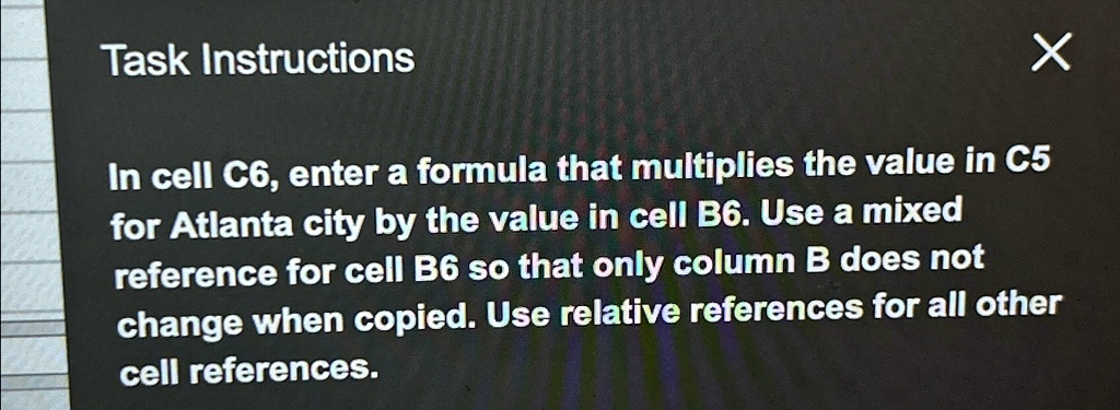 In spreadsheet applications such as Microsoft Excel or Google Sheets, formulas can incorporate absolute, relative, or mixed references to control how cell references adjust when copied across a range. For this task, the formula in cell C6 must multiply the value in C5, which corresponds to Atlanta city, by the value in B6 while ensuring that only the column reference for B6 remains fixed when copied.