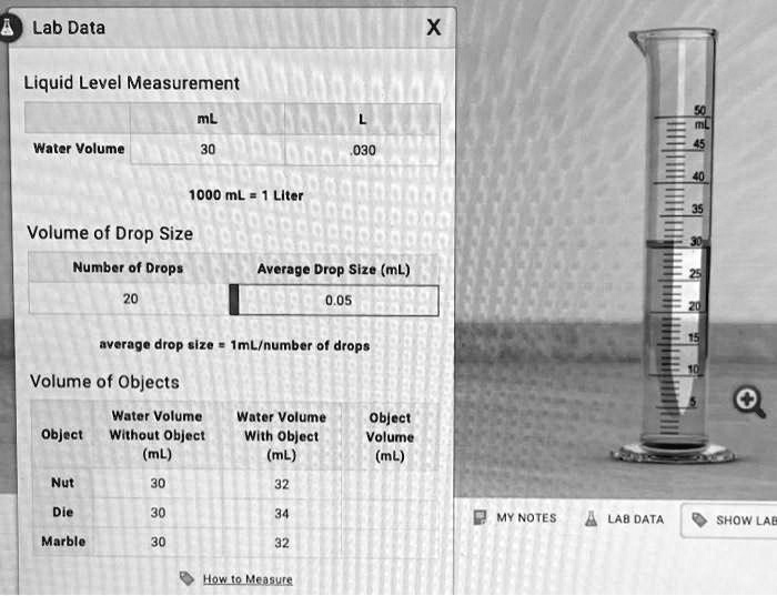 Liquid Level Measurement Water Volume 030 000 mL = Liter Volume of Drop Size Number of Drops Average Drop Size (mL) 0.05 average drop size (mL/number of drops) Volume of Objects Water Volume Object Without Object (mL) Water Volume With Object (mL) Object Volume (mL) Nut Die MY NOTES LAB DATA SHOW LATE Marble How to Measure