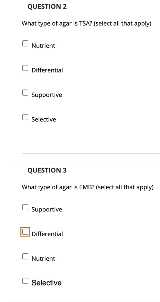 What type of agar is TSA? (select all that apply) Nutrient Differential Supportive Selective QUESTION 3 What type of agar is EMB? (select all that apply) Supportive Differential Nutrient Selective