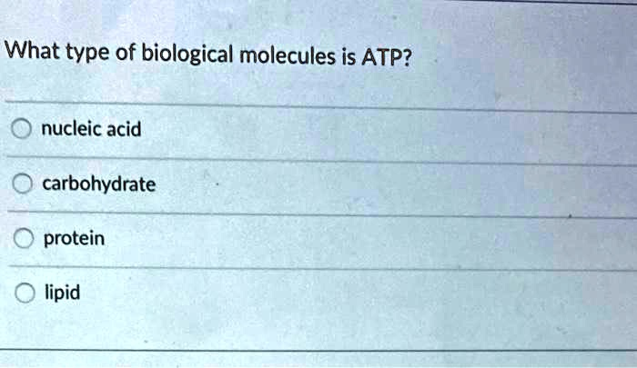 What type of biological molecules is ATP? nucleic acid carbohydrate protein lipid
