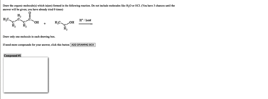 Draw the organic molecule(s) which is(are) formed in the following reaction. Do not include molecules like H?O or HCl. (You have 3 chances until the answer will be given; you have already tried 0 times) H HC H+/heat OH + H?C OH H? H H Draw only one molecule in each drawing box. If need more compounds for your answer, click this button ADD DRAWING BOX Compound #1