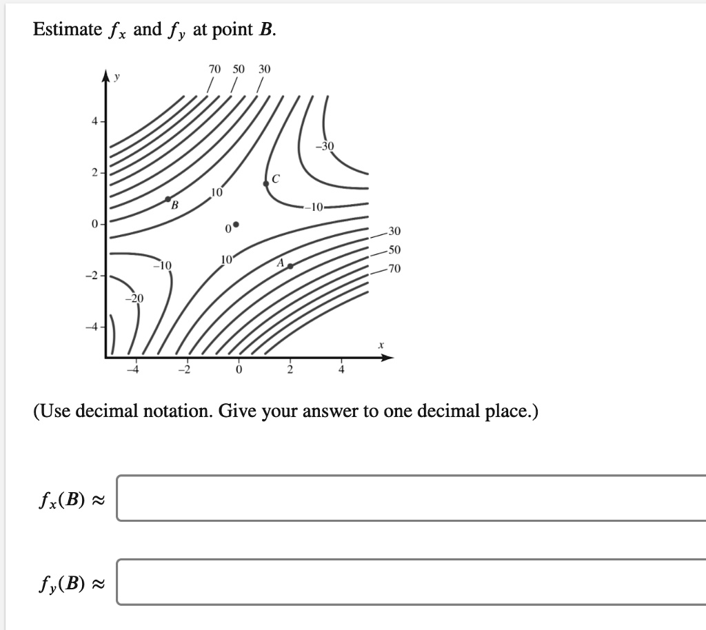 To estimate fx at point B, we analyze the contour lines in the region surrounding B. Point B is located between the contour lines labeled 0 and 10. Moving in the positive x-direction from B, the function value increases from 0 to 10 over a horizontal distance of approximately 4 units. The rate of change is found by dividing the change in function value by the change in x: