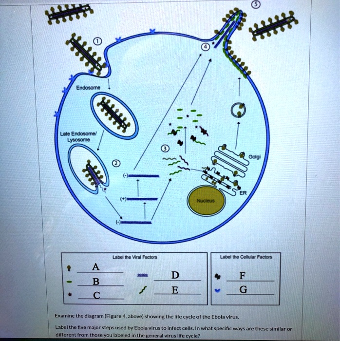 Endosome Late Endosome Lysosome Golgi Nucleus Lipid Inclusion Viral Factors Label Cellular Factors Examine the diagram (Figure above) showing the life cycle of the Ebola virus: Label the five major steps used by Ebola virus to infect cells. In what specific ways are these similar or different from those you labeled in the general virus life cycle?