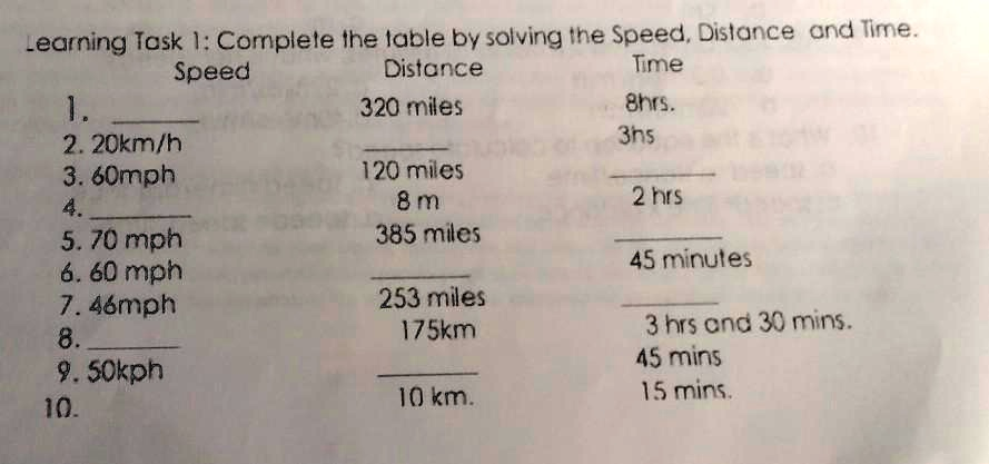 Learning Task 1: Complete the table by solving the Speed, Distance and Time. 1. 2. 20km/h Speed Distance 320 miles 120 miles 8 m 385 miles 3. 60mph 4. 5. 70 mph 6. 60 mph 7. 46mph 8. 253 miles 175km 10. 9. 50kph 10 km. Time 8hrs. 3hs 2 hrs 45 minutes 3 hrs and 30 mins
