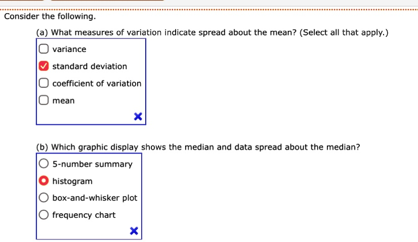 Consider the following. (a) What measures of variation indicate spread about the mean? (Select all that apply.) variance standard deviation coefficient of variation mean (b) Which graphic display shows the median and data spread about the median? 5-number summary histogram box-and-whisker plot frequency chart