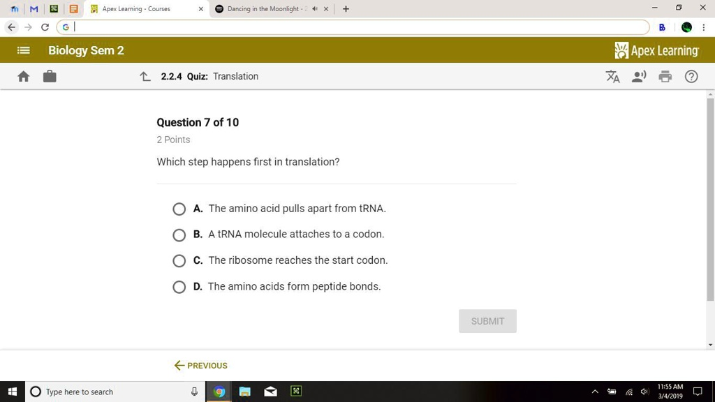 Translation Question 7 of 10 2 Points Which step happens first in translation? A. The amino acid pulls apart from tRNA. B. A tRNA molecule attaches to a codon. C. The ribosome reaches the start codon. D. The amino acids form peptide bonds.