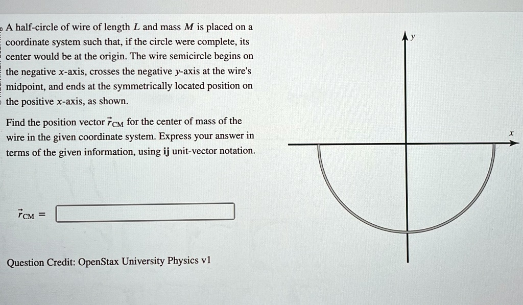 A half-circle of wire of lengthand massis placed on a coordinate system such that, if the circle were complete, its center would be at the origin.