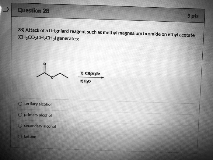 Attack of a Grignard reagent such as methylmagnesium bromide (CH3CO2CH2CH3) generates on ethyl acetate: CH3MgBr 2) H2O tertiary alcohol primary alcohol secondary alcohol ketone