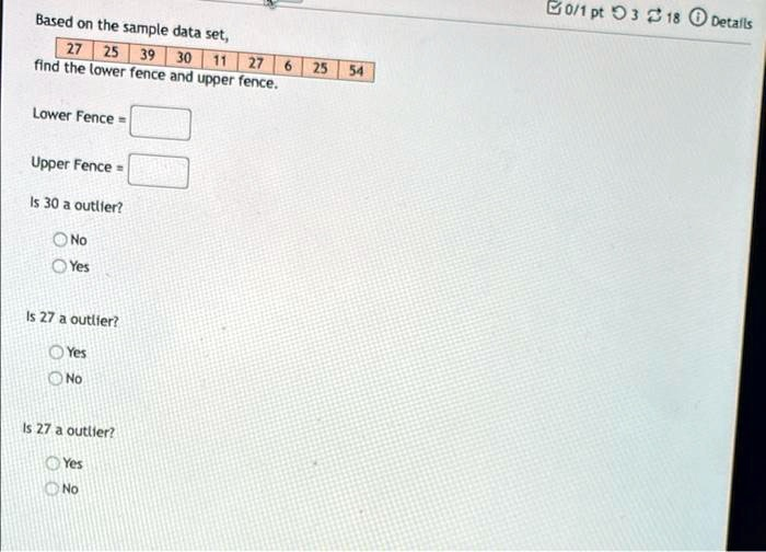 Based on the sample data set, 27 25 39 30 11 27 6 25 54 find the lower fence and upper fence. Lower Fence = Upper Fence = Is 30 a outlier? No Yes Is 27 a outlier? Yes No Is 27 a outlier? Yes No