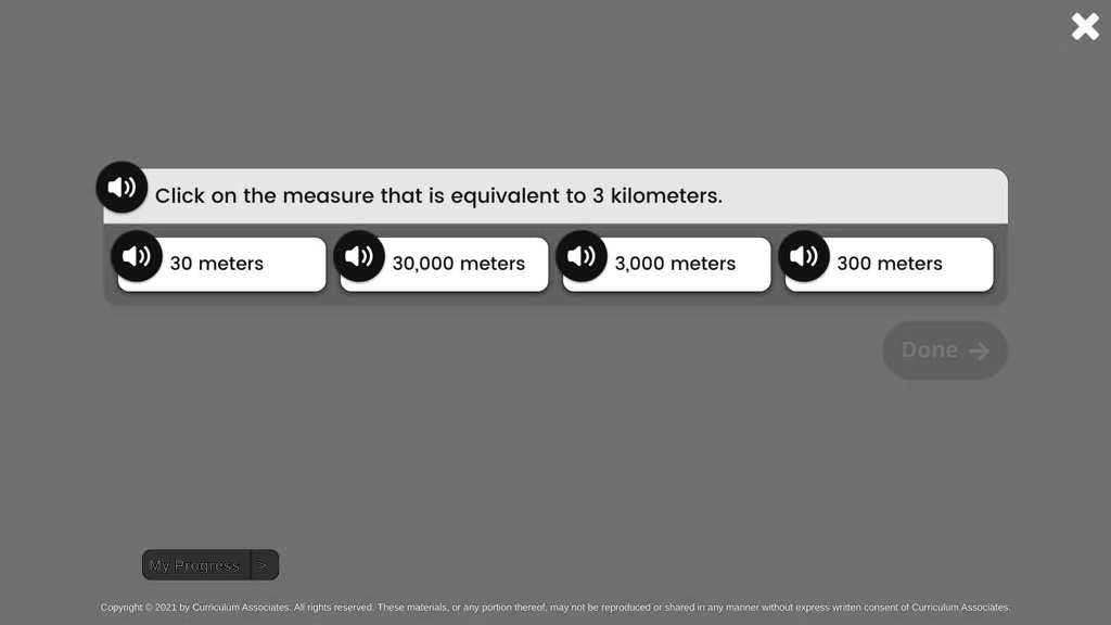 Click on the measure that is equivalent to 3 kilometers. 30 meters 30,000 meters 3,000 meters 300 meters