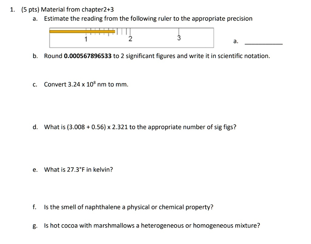 Material from Chapter 2+3: Estimate the reading from the following ruler to the appropriate precision. Round 0.000567896533 to 2 significant figures and write it in scientific notation. Convert 3.24 x 10^8 nm to mm. What is (3.008 + 0.56) x 2.321 to the appropriate number of sig figs? What is 27.3°F in Kelvin? Is the smell of naphthalene a physical or chemical property? Is hot cocoa with marshmallows a heterogeneous or homogeneous mixture?
