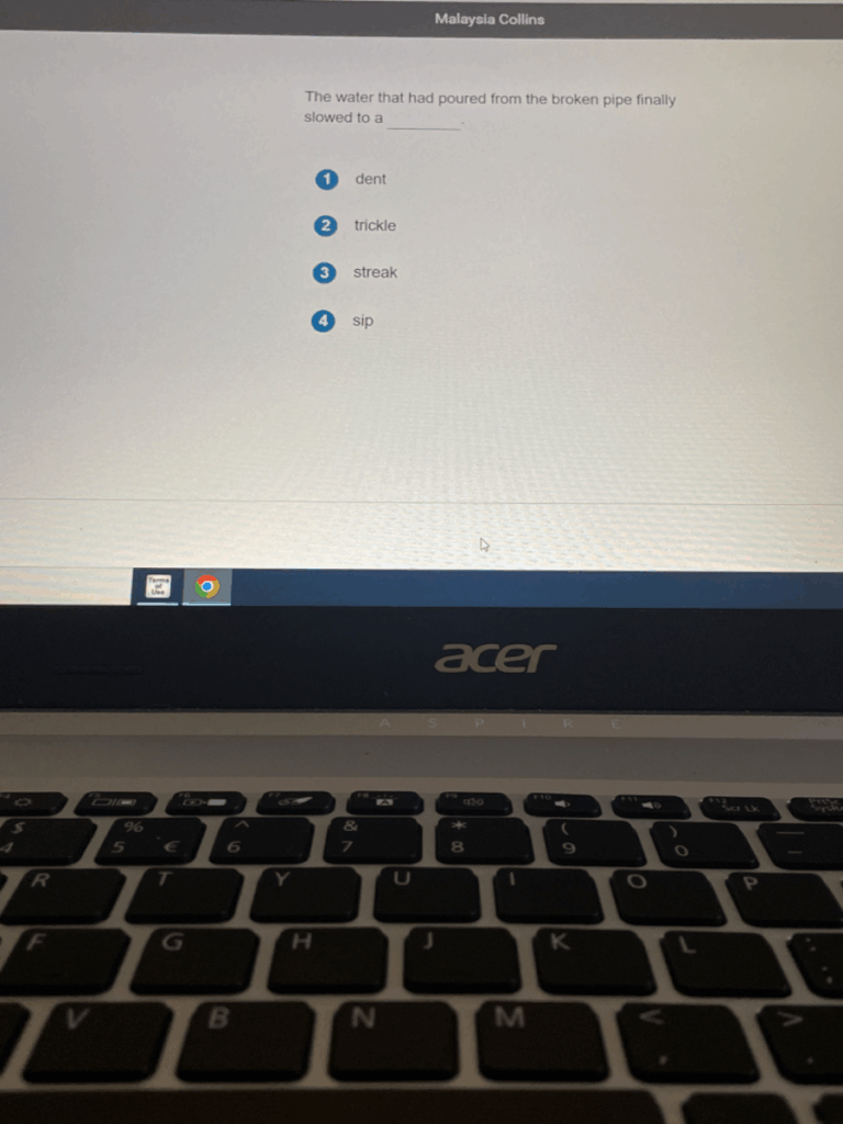 Malaysia Collins The water that had poured from the broken pipe finally slowed to a 1 dent 2 trickle (3) streak (4) sip