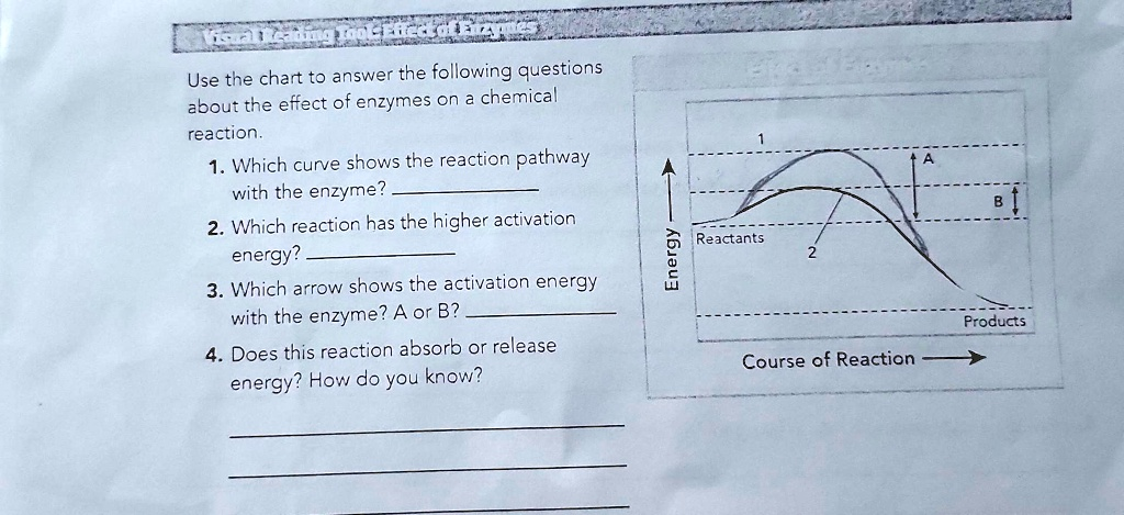 Use the chart to answer the following questions about the effect of enzymes on a chemical reaction. 1. Which curve shows the reaction pathway with the enzyme? 2. Which reaction has the higher activation energy? 3. Which arrow shows the activation energy with the enzyme? A or B? 4. Does this reaction absorb or release energy? How do you know? Energy 1 A B Reactants 2 Products Course of Reaction