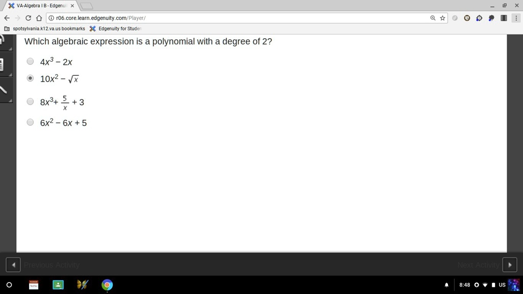 Which algebraic expression is a polynomial with a degree of 2? 4x³ – 2x 10x² – ?x 8x³ + \frac{5}{x} + 3 6x² – 6x + 5