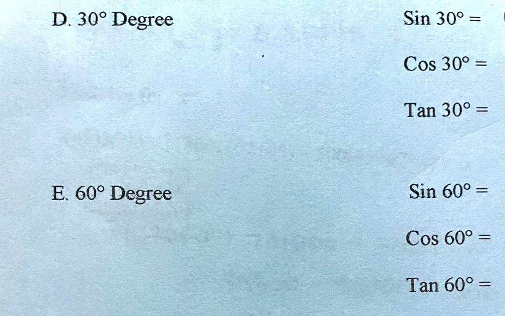 D. 30° Degree Sin 30° = Cos 30° = Tan 30° = E. 60° Degree Sin 60° = Cos 60° = Tan 60°