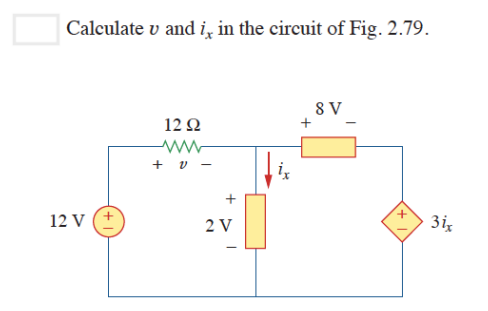 To determine the values of the voltage v and the current ix in the given circuit, we can utilize Kirchhoff’s Voltage Law (KVL). KVL states that the algebraic sum of all the voltages around any closed path, or loop, in a circuit is equal to zero. This circuit contains two distinct loops that can be analyzed independently to find the unknown variables.
