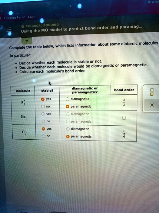 Chemical Bonding: Predicting Bond Order and Paramagnetism Using the MO Model To determine the stability and magnetic properties of diatomic molecules, we can use the molecular orbital (MO) model. The table below provides information about some diatomic molecules. Please complete the table by deciding whether each molecule is stable or not, whether it would be diamagnetic or paramagnetic, and calculating the bond order for each molecule. Molecule Stable? Bond Order Magnetic Properties ——————————————————– Yes Diamagnetic No Paramagnetic Yes Diamagnetic Yes Paramagnetic No Diamagnetic Yes Paramagnetic