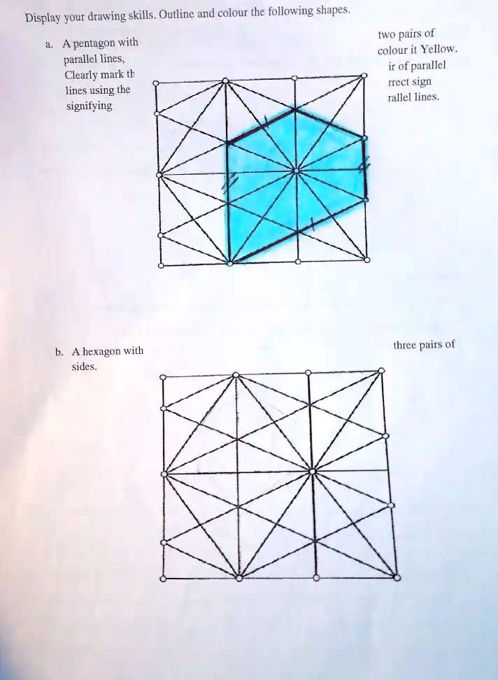 Display your drawing skills. Outline and colour the following shapes. a. A pentagon with parallel lines, Clearly mark th lines using the signifying two pairs of colour it Yellow. ir of parallel rrect sign rallel lines. b. A hexagon with three pairs of sides.