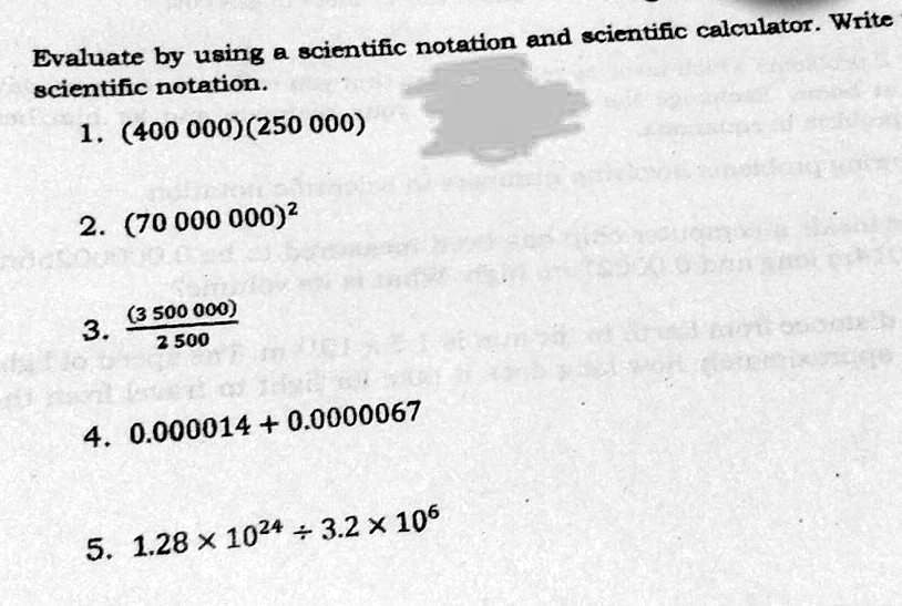 Evaluate by using a scientific notation and scientific calculator. Write scientific notation. 1. (400 000)(250 000) 2. (70 000 000)