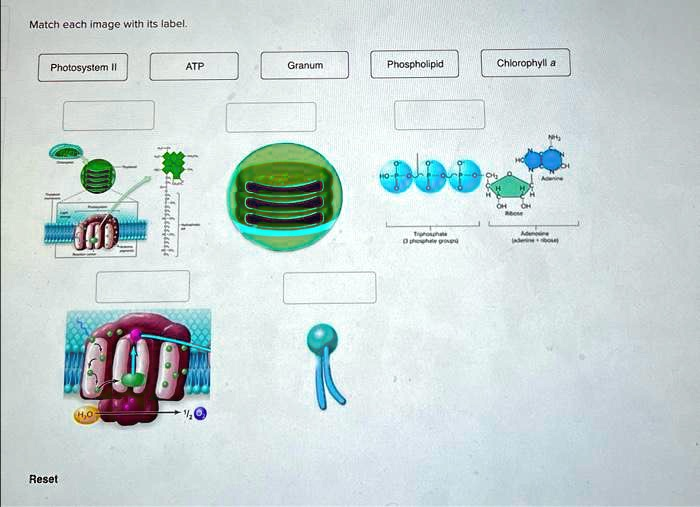 Match each image with its label. Photosystem II ATP Granum Phospholipid Chlorophyll a Reset