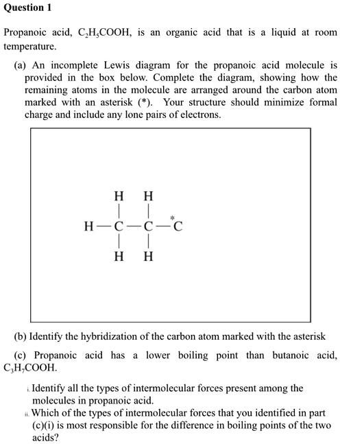 Propanoic acid, C3H6COOH, is an organic acid that is liquid at room temperature. An incomplete Lewis diagram for the propanoic acid molecule is provided in the box below. Complete the diagram, showing how the remaining atoms in the molecule are arranged around the carbon atom marked with an asterisk. Your structure should minimize formal charge and include any lone pairs of electrons. H | C-*-C | H (b) Identify the hybridization of the carbon atom marked with the asterisk. (c) Propanoic acid has a lower boiling point than butanoic acid, CH3CH2COOH. Identify all the types of intermolecular forces present among the molecules in propanoic acid. Which of the types of intermolecular forces that you identified in part (c)(i) is most responsible for the difference in boiling points of the two acids?