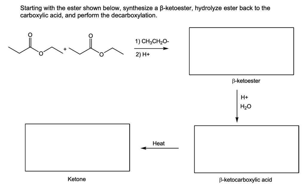 Starting with the ester shown below, synthesize a ?-ketoester, hydrolyze ester back to the carboxylic acid, and perform the decarboxylation