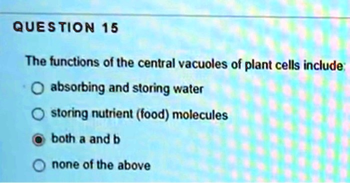question 15 The functions of the central vacuoles of plant cells include absorbing and storing water storing nutrient (food) molecules both a and b none 0f the above