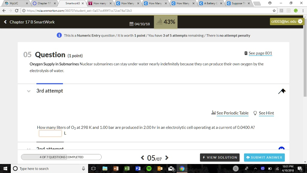 MyLVC X Chapter 17 X Smartwork5 X Y How many X How Many X ??C https://ncia.wwnorton.com/36070?student_set=5a57cc499f7cc72ce74a72b3 < Chapter 17 B SmartWork How Many X How Many X A Battery C. XC Suppose Th X e 43% 04/10/18 This is a Numeric Entry question / It is worth 1 point/You have 3 of 5 attempts remaining / There is no attempt penalty 05 Question (1 point) See page 801 Oxygen Supply in Submarines Nuclear submarines can stay under water nearly indefinitely because they can produce their own oxygen by the electrolysis of water. 3rd attempt [email protected] See Periodic Table See Hint How many liters of O2 at 298 K and 1.00 bar are produced in 2.00 hr in an electrolytic cell operating at a current of 0.0400 A? L 2nd attempt 4 OF 7 QUESTIONS COMPLETED Type here to search < 05/07 > + VIEW SOLUTION SUBMIT ANSWER 10:31 PM 4/10/2018