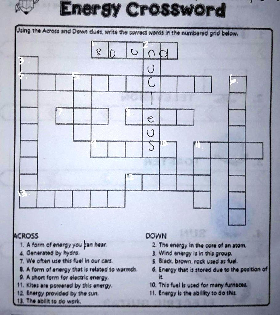 Energy Crossword Using the Across and Down clues, write the correct words in the numbered grid below. 80 and C e ACROSS 1. A form of energy you can hear. 4. Generated by hydro. 7. We often use this fuel in our cars. 8. A form of energy that is related to warmth. 9. A short form for electric energy. 11. Kites are powered by this energy. 12. Energy provided by the sun. 13. The abilit to do work. DOWN 2. The energy in the core of an atom. 3. Wind energy is in this group. 5. Black, brown, rock used as fuel. 6. Energy that is stored due to the position of it. 10. This fuel is used for many furnaces. 11. Energy is the ability to do this.