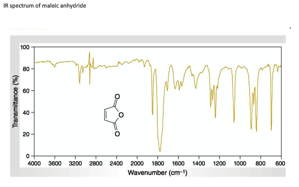IR spectrum of maleic anhydride 100 80 2 60 L 40 20 4000 3600 3200 2800 2400 2000 1800 1600 1400 1200 1000 800 Wavenumber (cm-1) 600