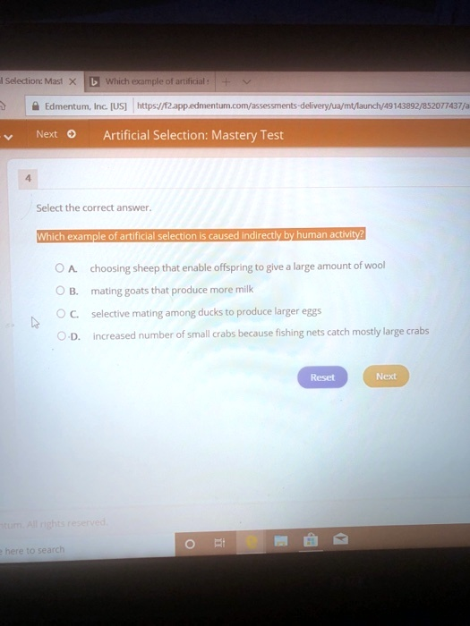 Selection: Mast X Which example of artificials + Edmentum, Inc. [US] https://f2.app.edmentum.com/assessments-delivery/ua/mt/launch/49143892/852077437/a Next Artificial Selection: Mastery Test 4 Select the correct answer. Which example of artificial selection is caused indirectly by human activity? A choosing sheep that enable offspring to give a large amount of wool B. mating goats that produce more milk C. selective mating among ducks to produce larger eggs D. Increased number of small crabs because fishing nets catch mostly large crabs turn. All rights reserved. e here to search Reset Next