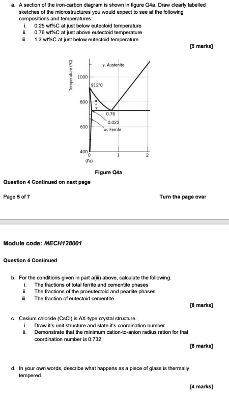 A section of the iron-carbon diagram is shown in figure Q4a. Draw clearly labelled sketches of the microstructures you would expect to see at the following compositions and temperatures: i. 0.25 wt%C at just below eutectoid temperature ii. 0.76 wt%C at just above eutectoid temperature iii. 1.3 wt%C at just below eutectoid temperature [5 marks] Question 4 Continued on next page Page 5 of 7 Turn the page over Module code: MECH128001 Question 4 Continued b. For the conditions given in part a(iii) above, calculate the following: i. The fractions of total ferrite and cementite phases ii. The fractions of the proeutectoid and pearlite phases iii. The fraction of eutectoid cementite [8 marks] c. Cesium chloride (CsCl) is AX-type crystal structure. i. Draw it’s unit structure and state it’s coordination number ii. Demonstrate that the minimum cation-to-anion radius ration for that coordination number is 0.732. [8 marks] d. In your own words, describe what happens as a piece of glass is thermally tempered. [4 marks]