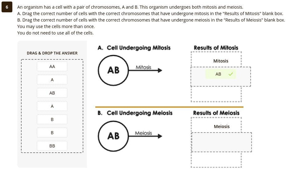An organism has a cell with a pair of chromosomes, A and B. This organism undergoes both mitosis and meiosis. A. Drag the correct number of cells with the correct chromosomes that have undergone mitosis in the “Results of Mitosis” blank box. B. Drag the correct number of cells with the correct chromosomes that have undergone meiosis in the “Results of Meiosis” blank box. You may use the cells more than once. You do not need to use all of the cells. A. Cell Undergoing Mitosis Results of Mitosis DRAG & DROP THE ANSWER Mitosis AA AB Mitosis AB A AB A B. Cell Undergoing Meiosis Results of Meiosis B Meiosis B AB Meiosis BB