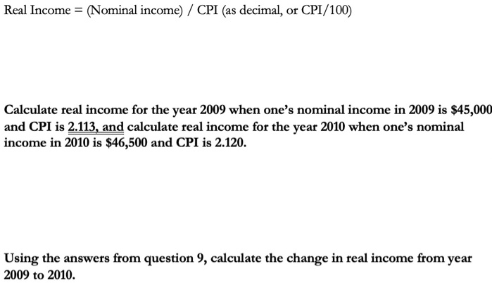 Real Income = (Nominal income) / CPI (as decimal, or CPI/100)