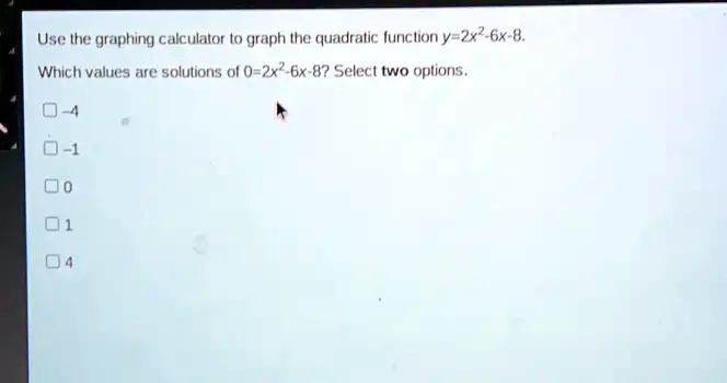 The prompt suggests using a graphing calculator. If you were to graph the function y = 2x² – 6x – 8, you would see a parabola that opens upwards. The points where this parabola intersects the horizontal x-axis are the solutions. The graph would cross the x-axis at x = -1 and x = 4. Therefore, these are the two solutions to the equation.