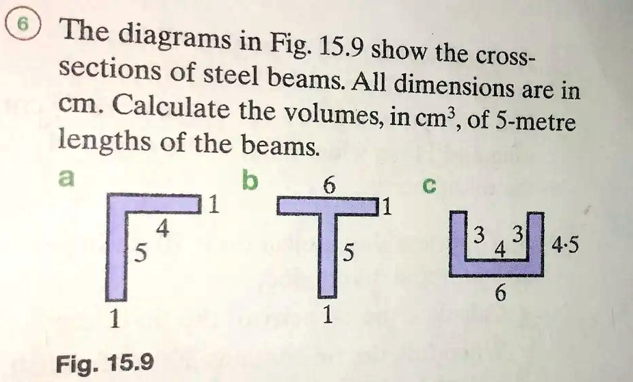 The diagrams in Fig. 15.9 show the cross-sections of steel beams. All dimensions are in cm. Calculate the volumes, in
