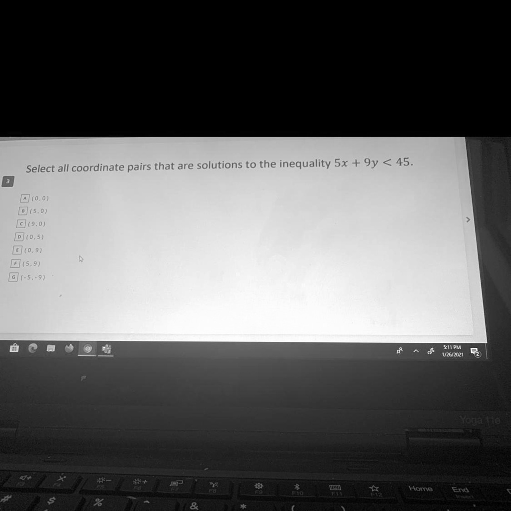 The inequality given is 5x+9y<455x + 9y < 455x+9y<45, and we are asked to determine which coordinate pairs satisfy this inequality.