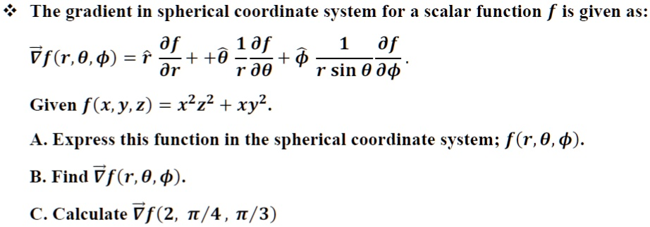 The gradient in spherical coordinates is given by:∇f(r,θ,ϕ)=r^∂f∂r+θ^1r∂f∂θ+ϕ^1rsin⁡θ∂f∂ϕ\nabla f(r, \theta, \phi) = \hat{r} \frac{\partial f}{\partial r} + \hat{\theta} \frac{1}{r} \frac{\partial f}{\partial \theta} + \hat{\phi} \frac{1}{r \sin\theta} \frac{\partial f}{\partial \phi}∇f(r,θ,ϕ)=r^∂r∂f​+θ^r1​∂θ∂f​+ϕ^​rsinθ1​∂ϕ∂f​