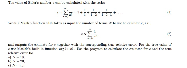 This series converges quickly, so we can approximate eee by summing the first NNN terms. The true value of eee is exp⁡(1.0)\exp(1.0)exp(1.0) in MATLAB, and we can compute the relative error as follows:True Relative Error=∣eapprox−etrue∣etrue\text{True Relative Error} = \frac{|e_{\text{approx}} – e_{\text{true}}|}{e_{\text{true}}}True Relative Error=etrue​∣eapprox​−etrue​∣​