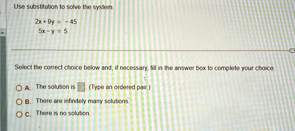 Now that we have an expression for y, we substitute it into the first equation, 2x + 9y = -45. This step replaces the y variable in the first equation with our new expression involving x. The substitution results in the following equation with only one variable, x: