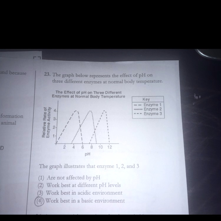 The graph below represents the effect of pH on three different enzymes at normal body temperature. The Effect of pH on Three Different Enzymes at Normal Body Temperature Relative Rate of Enzyme Activity 4- 3- 2- 1- 2 4 6 8 10 12 PH The graph illustrates that enzyme 1, 2, and 3 (1) Are not affected by pH (2) Work best at different pH levels (3) Work best in acidic environment (4) Work best in a basic environment Key Enzyme 1 Enzyme 2 Enzyme 3